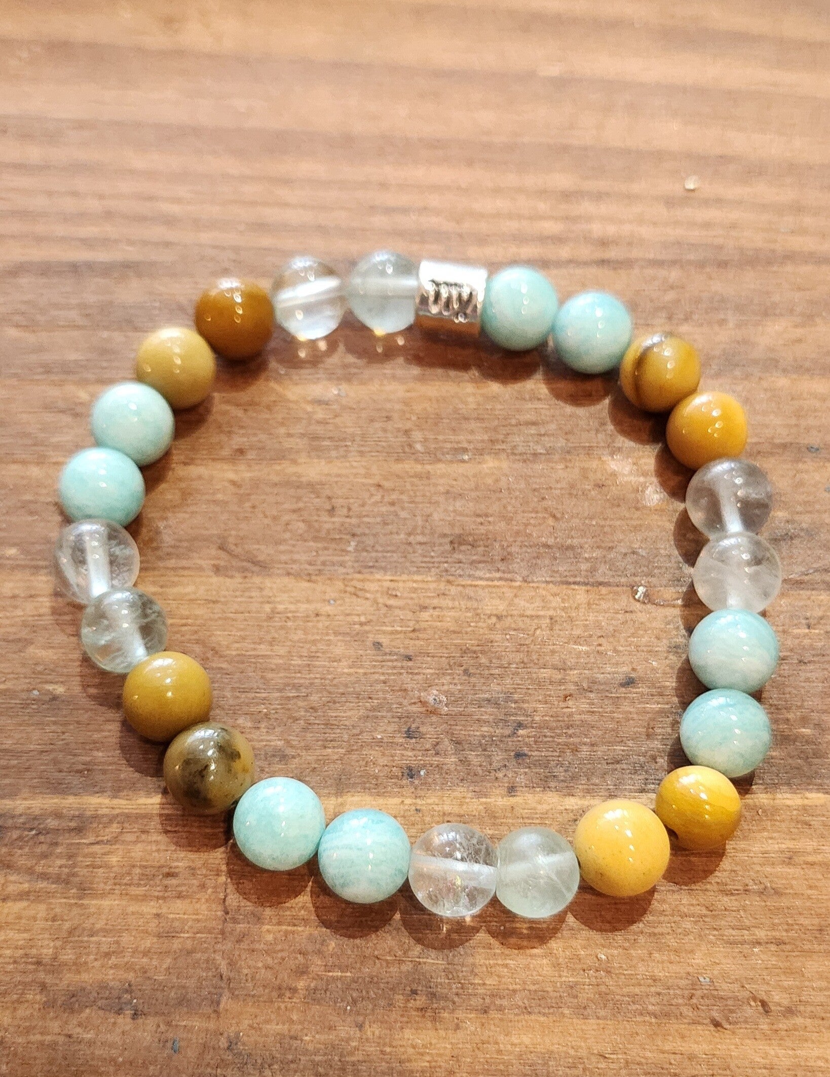 Bracelet astro'gemmes VIERGE, composé de de 8 mm en Amazonite, mokaîte, fluorite + 1 entretoise signe du vierge en métal argenté, de sa boite en métal pour le rangement
