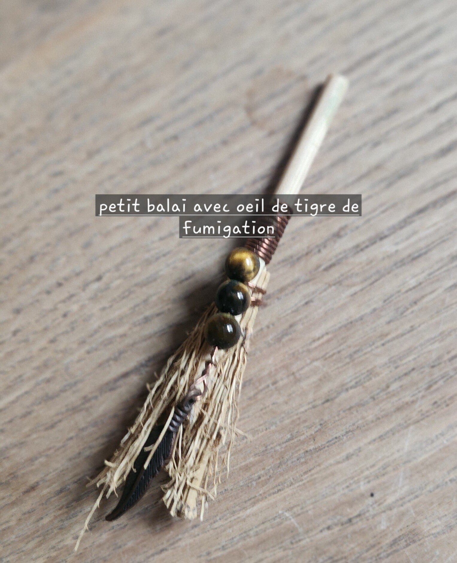 petit balai avec perles oeil de tigre pour disperser la fumée